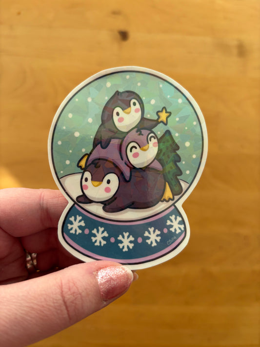 Penguin Pile Snowglobe holographic vinyl sticker (large)