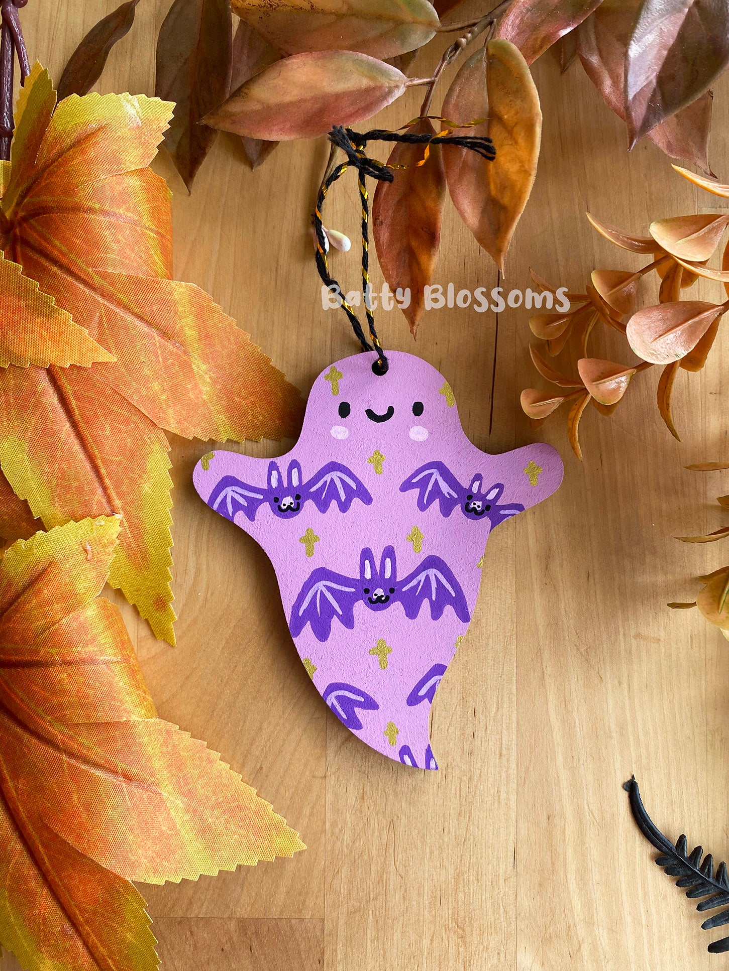 Please note: each ghostie is hand painted by me, so there may be slight variations in design placement from the examples shown.